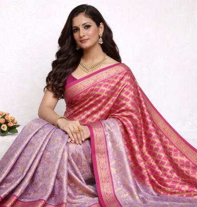 The saree features a rich pink body woven with golden geometric zari motifs, beautifully balanced by a soft lavender silk pallu and pleats adorned with intricate floral brocade πΈ.